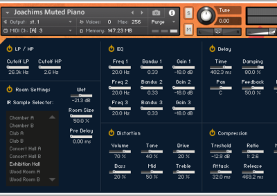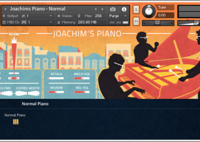 The instrument sampled was an 85-key Steinway Model B, build in the 1890’s and recently (beautifully) restored. The vintage tone and responsiveness perfectly match Joachim’s style of performance, yet it has been sampled in such a way to allow it to fit numerous uses from live jazz to media composition.