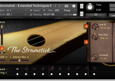 In addition to your typical finger plucks and picked strums, we also included some truly esoteric strumstick goodies- bowed articulations including standard arco, tremolo, and trills performed in da gamba fashion, slide effects and chords, and a full range of different hammered dulcimer mallet techniques.