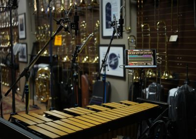 Underneath the vibraphone are a whisper-quiet pair of Gefell M940 supercardioid LDC’s. Even lower noise than the M930Ts, these microphones capture the resonance and body of the instrument in a configuration mirroring the overheads.